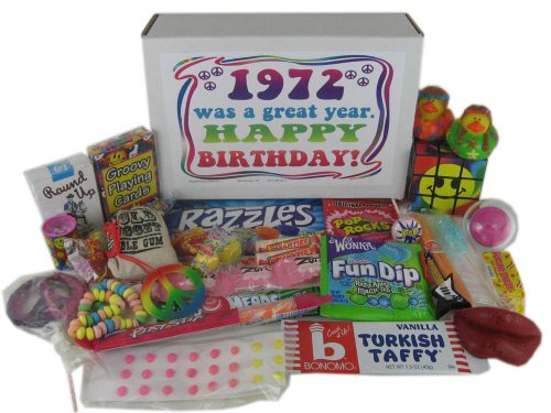 This "far out" fun 40th birthday gift is filled with candy and toys that will bring back lots of memories to a forty year old hippie! You'll get: Candy Cigarettes, Pop Rocks, Razzles, 2 mini Jawbreakers, 2 Atomic Fireballs, 2 mini Bonomo Turkish Taffy, 2 Smarties, Smartie Pop, 2 Air Heads, 2 Lemon Heads, Zotz, Fun Dip, Bubble Gum Cigar, Wax Lips,, Pixy Stix, Candy Necklace, Gold Nugget Bubble Gum, Milton Bradley Board Game candy, Candy Buttons on Paper, Groovy Playing Cards, Magic Cube, Prism Viewer, Spinning Top, Peace Sign Necklace, Hippie Rubber Ducks, and a mini guitar ornament.B002DLB3I2ASIN