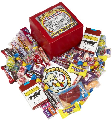 Here's a candy sampler at a reasonable price that delivers quality American candies packaged in a nifty gift box at a reasonable price. Includes classic candies such as Atomic Fireballs, Lemonheads, Candy Cigarettes, Charleston Chew, Dum Dum Pops, Goldenberg Peanut Chews, Necco Wafer Roll Mini, Pixie Sticks, Reese's Peanut Butter Cups, Wack-o-Wax Wax Lips, Space Food Sticks, Razzles, Pez, Nik-L-Nips, Candy Necklaces and more. Plus a free collectible Funkyfoodshop high-res sticker.B0048MB988ASIN