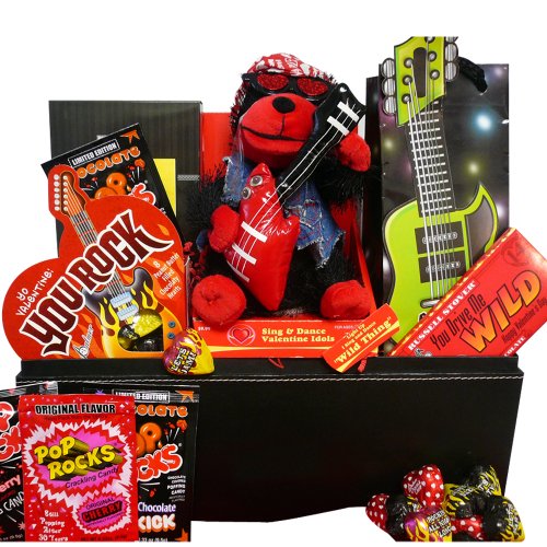 This awesome Valentine gift basket is made for that special wild one or teen on your love day gift giving list. Let them know how much you care with this "You Rock!" message that's sung loud and clear by this singing, dancing plush teddy bear with guitar - they'll love listening to his musical rendition of "Wild Thing!". Your gift also includes delicious treats, including a "Wild Thing" Guitar Heart Gift Box with chocolate candy confections, a Guitar Gift Bag filled with individually wrapped Cookies and Cream Hearts, 3 packages of Pop Rocks in Chocolate, Cherry and Strawberry Flavors, "You Drive Me Wild" Candy Bar, and a box of gourmet Cinnamon Sugar Cookies. Each gift is carefully hand crafted and presented in a beautiful gift basket, tied with ribbons and includes a personalized gift message from you to convey your heartfelt best wishes.An original gift basket arrangement designed and created for you by Art of Appreciation Gift Baskets.