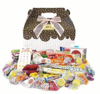 This 1960's Retro candy gift box is full of favorite nostalgic candy assortments from past decades. Makes a GREAT GIFT!Assortment includes: Abba Zaba Minis, BB Bats, Big Hunk Minis, Boston Baked Beans, Canada Mints, Candy Buttons, Candy Cigarettes, Charms Assorted Squares, Charms Sweet & Sour Pops, Cherry Heads, Cinnamon Toothpicks, Coconut Bars, Fizzies, Gold Mine Gum, Good & Plenty, Hot Tamales, Jujubes, Licorice Pipes, Red Hots, Sugar Daddy Pops, Sweetarts, Teaberry Gum, Wax Lips, Atomic Fireballs, Candy Necklace, Jawbreakers, Lemonheads, Necco Wafers, Now & Laters & Walnettos. Contains over 55 pieces (a mixture of small, medium & full size candies) & weighs between 2 - 2 1/2 pounds. Box size approx. 8"x5"x8". Some items may be substituted when necessary.1960's Sprinkled Pink Retro Candy Gift Box Feature