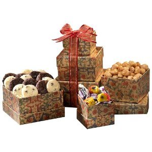 Express your holiday wishes warmly to friends, family, clients, and associates by sending a shimmering Gift Tower of Sweets from Broadway Basketeers. Each individually wrapped container in this three-box tower is filled with a gourmet spread of treats to please all palates. The elegant, hand-crafted gift comes tied with a ribbon and includes a personalized message on a gift card from you.Sure to please, the Tower of Sweets is brimming with chocolate covered cherries, butter toffee peanuts, gourmet pretzels, and gourmet chocolate chip cookies. All foods in the gift tower are certified kosher for worry-free giving. Click on gift options during check-out to enter your gift message on a personalized card.