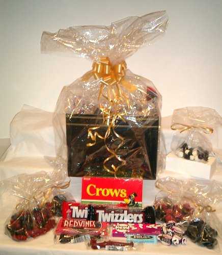 The Licorice Candy Gift Basket gives you approximately 100 pieces of delicious licorice. If you love licorice, you'll love this delectable assortment of old fashion licorice.Our basket includes black and red Licorice Scottie Dogs (1/4 Lb. each), black and white Licorice Mix (1/4 Lb.), Licorice Dollars (1/2 Lb.), black and red Licorice Chews (1/4 Lb. each), Licorice Wheels, red and black Licorice Pipes, Crows Licorice Gum Drops, Good N Plenty, Black Jack Gum, Red Vine Licorice, black and red Twizzlers, and old fashion Black Taffy with red bullseye. The basket is black with gold trim and comes beautifully wrapped in cellophane and finished off with a coordinating gold satin bow.Licorice Candy Gift Basket Feature